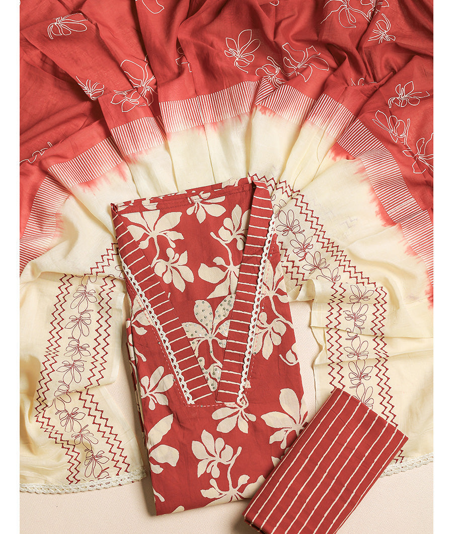 Elevate your ethnic wardrobe with this timeless Cotton suit set, crafted with a blend of tradition and subtle luxury. Woven from lightweight, breathable fabric, this ensemble features a delicate sheen and soft texture that embodies understated elegance. This set consists of Cotton Top with neck work paired with matching Dupatta and bottom.