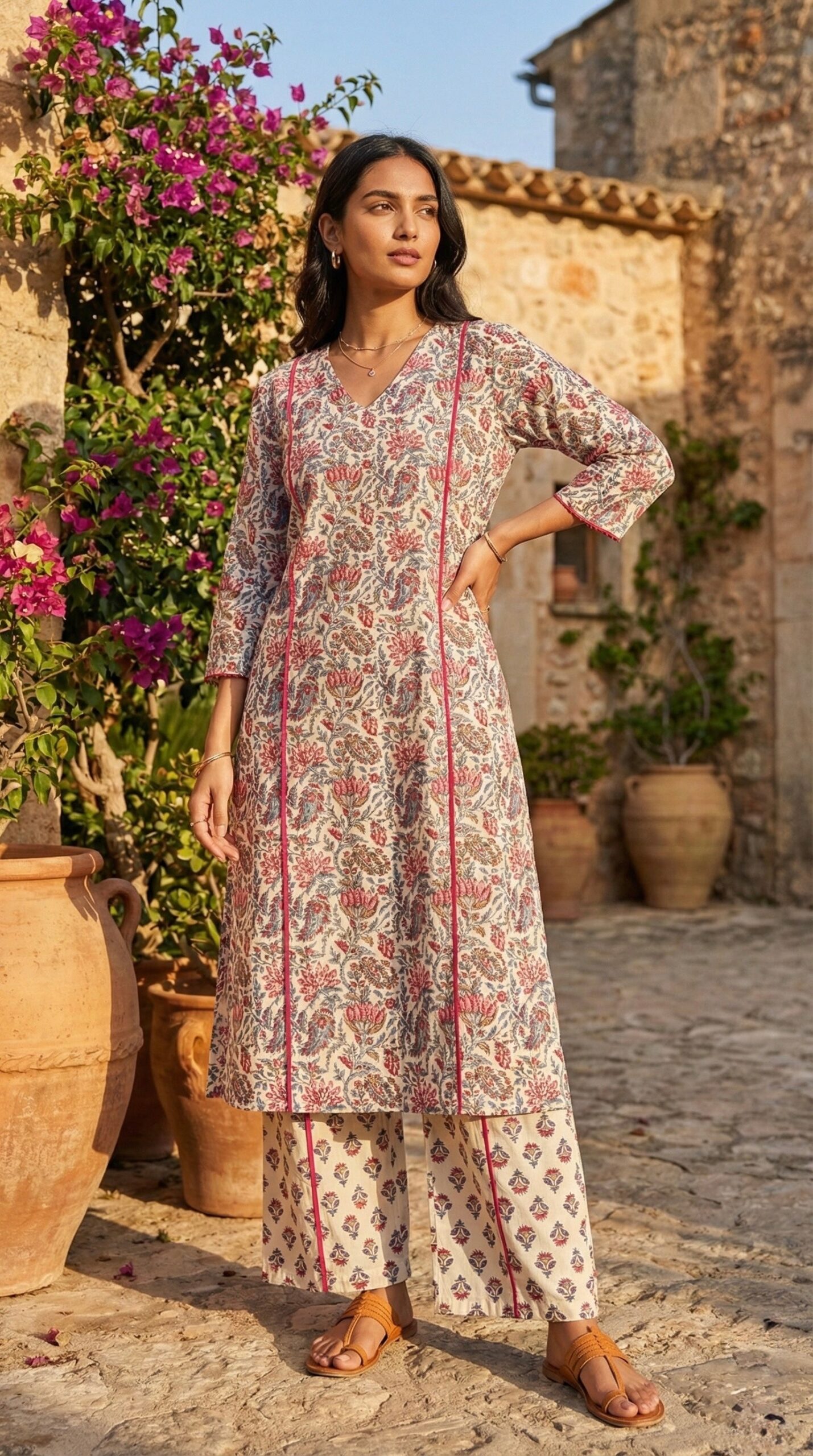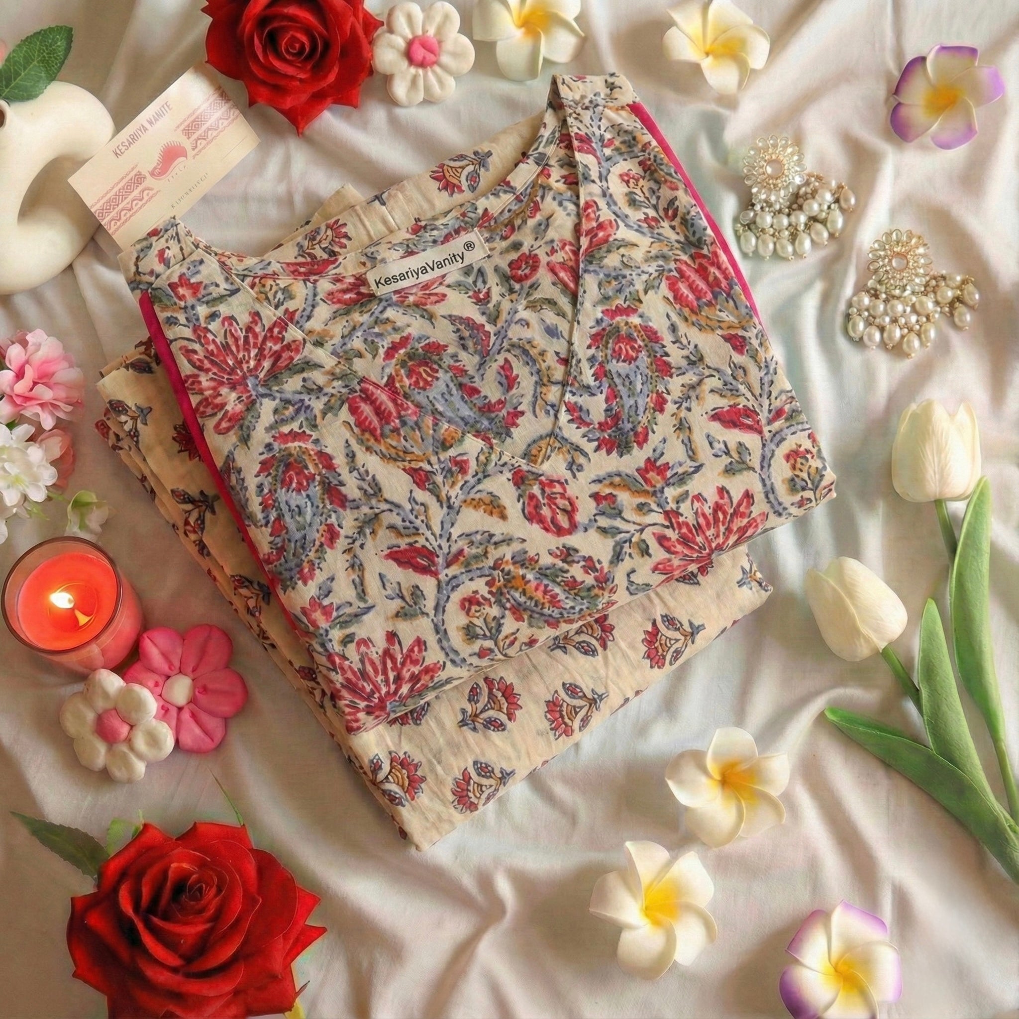 Elevate your everyday style with our Comforter Suit Set 3.0, featuring a stunning honey yellow A-line kurta with a flattering V-neck and sleeveless design. Adorned with delicate pink floral prints, this set effortlessly blends elegance with ease, making it a perfect choice for both office and casual outings.