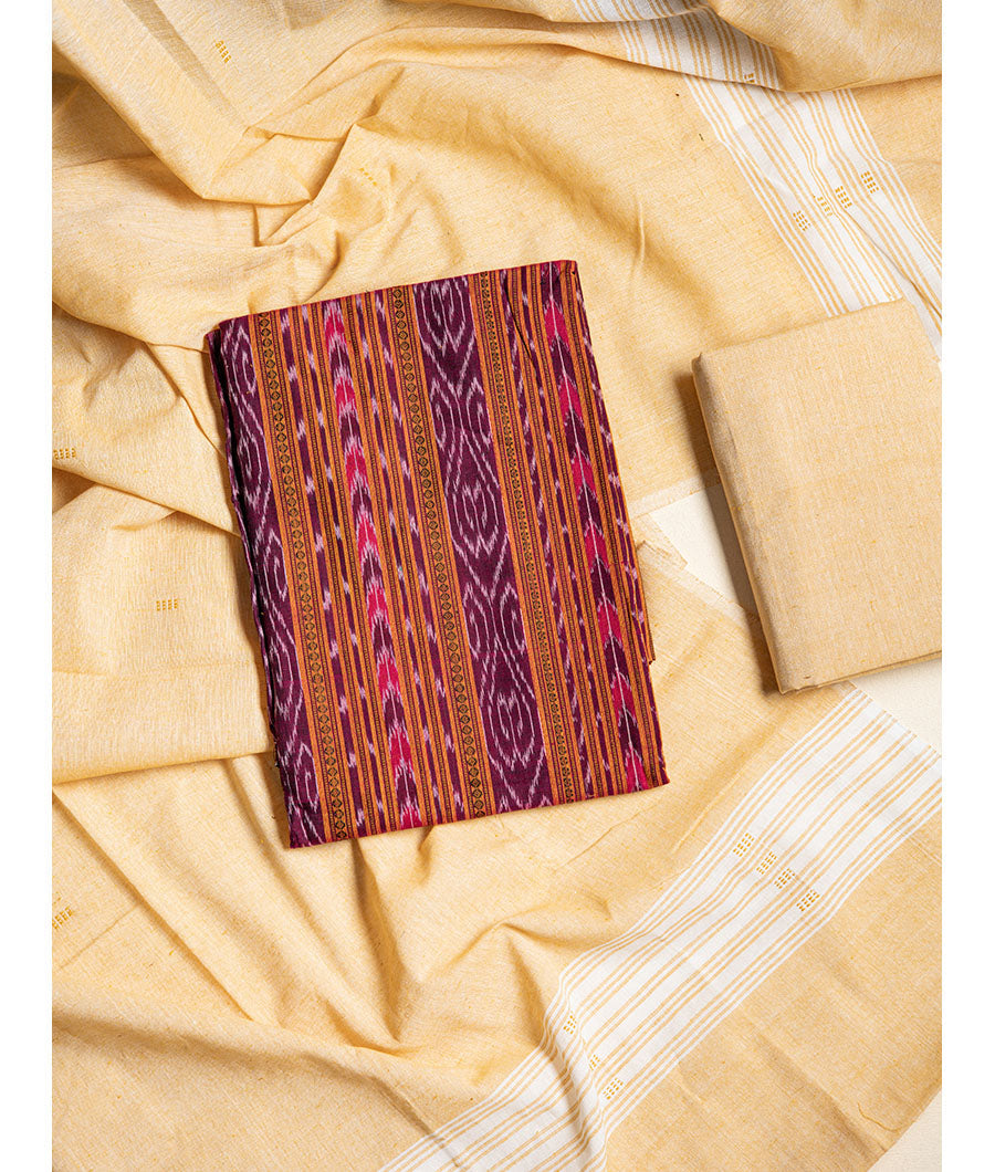 Indulge in the serene charm of our Sambalpur ikat suits set, where traditional craftsmanship meets modern elegance. Crafted from the finest cotton, this ensemble promises unmatched comfort and style. This Pair comes with beautiful samblpuri ikat top paired with beautiful dupatta and plain bottom.Â